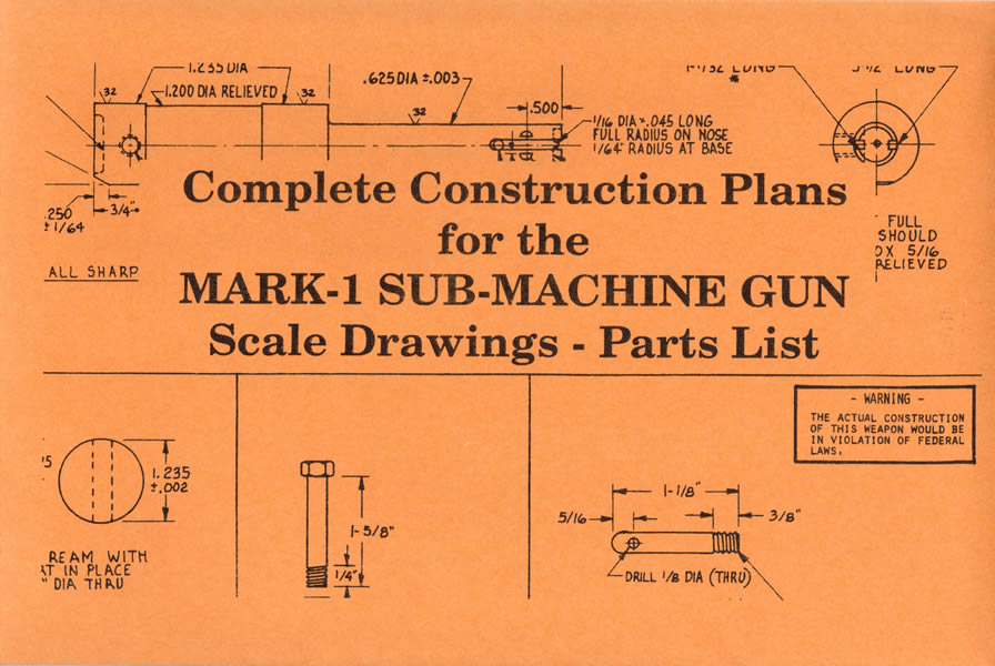 COMPLETE CONSTRUCTION PLANS FOR A SUBMACHINE GUN THAT CAN BE BUILT AT HOME FORLESS THAN $30.00 NUMEROUS ILLUSTRATIONS, PARTS LIST AND SCALE DRAWINGS ARE INCLUDED. 8 PGS