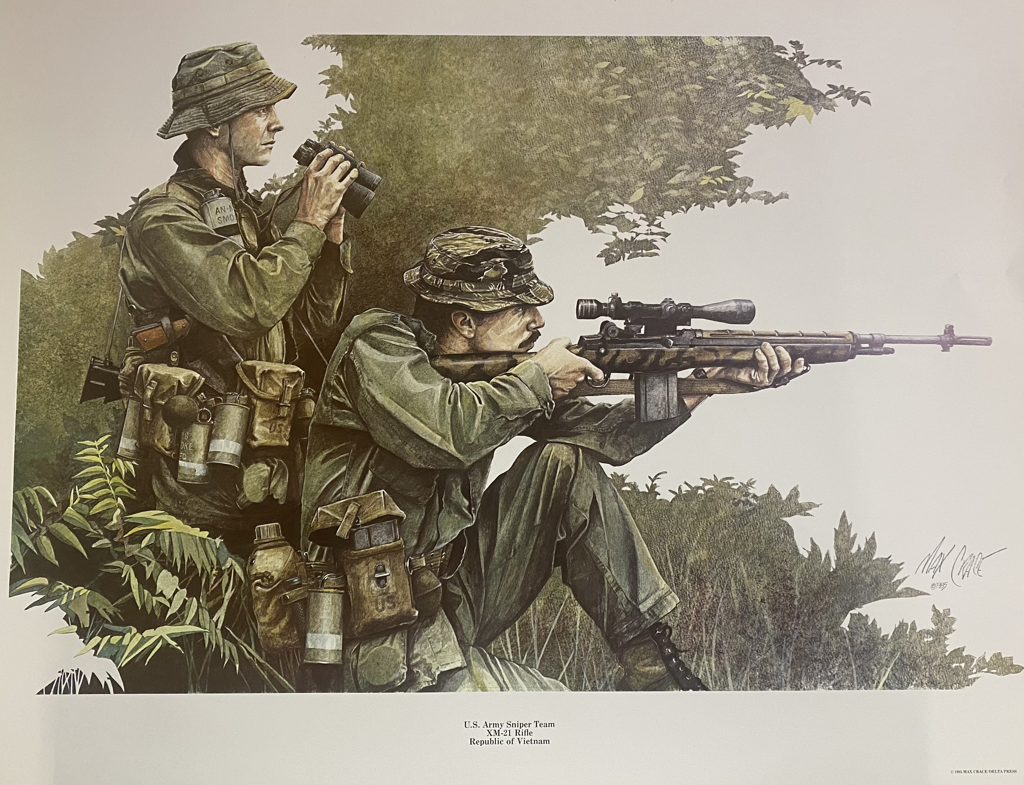THIS WAS THE REPUTATION GAINED BY THE US ARMY SNIPERS IN VIETNAM USING AN ACCURIZED M-14 WITH AN ART SCOPE. FIRST ROUND KILLS AT 800 YARDS WERE COMMON. THIS EXCELLENT PAINTING IS ONE OF THE LATEST EFFORTS BY MAX CRACE, CO AUTHOR OF VISIONS