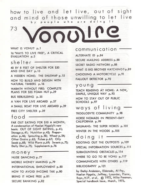 The Search For Personal Freedom. Live Out of Sight and Out of Mind of Those Unwilling to Let Live! Vonu means invulnerability to coercion . This incredible 80,000 word booklet covers all aspects of survival and living off the land (shelter, food, communications, etc.) An incredible value. This is hard-core material, differentiating between liberty and freedom . VONU is an excellent example of the type of thinking necessary to break free and live your own life. It is for those willing to go to lengths to be rid of Big Brother and other oppressors.